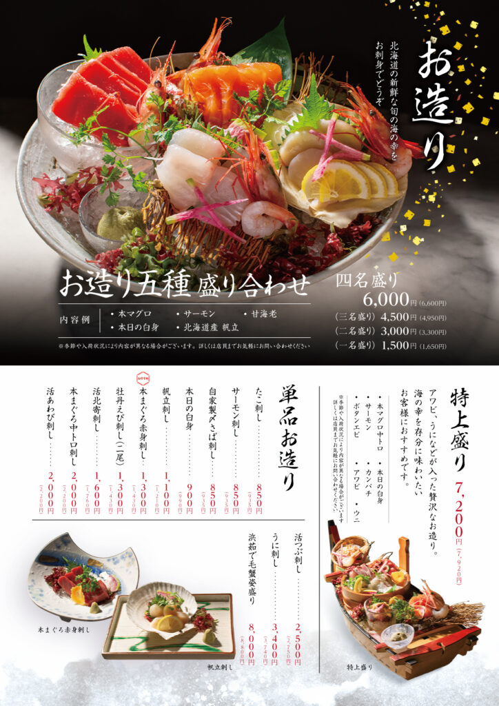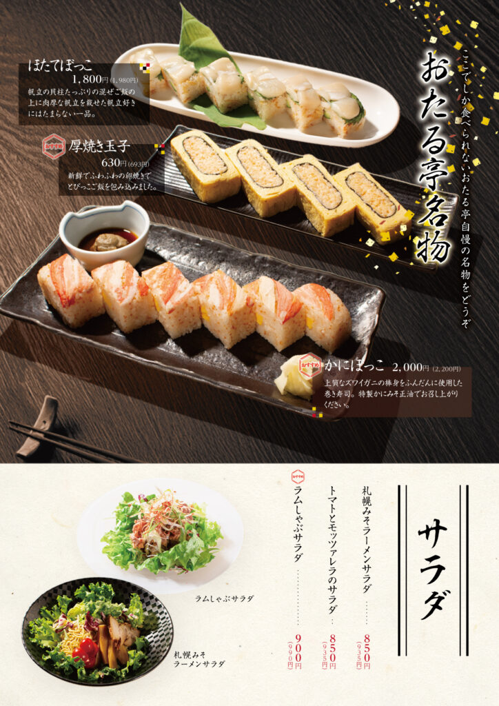 サイトをご覧いただきありがとうございます。グランドメニューが2025年12月よりリニューアル! おたる亭すすきのビル店の美しい料理がもっと見やすく、選びやすい内容になりました!新しいメニューで愉しくお酒やお食事の時間をお […] -